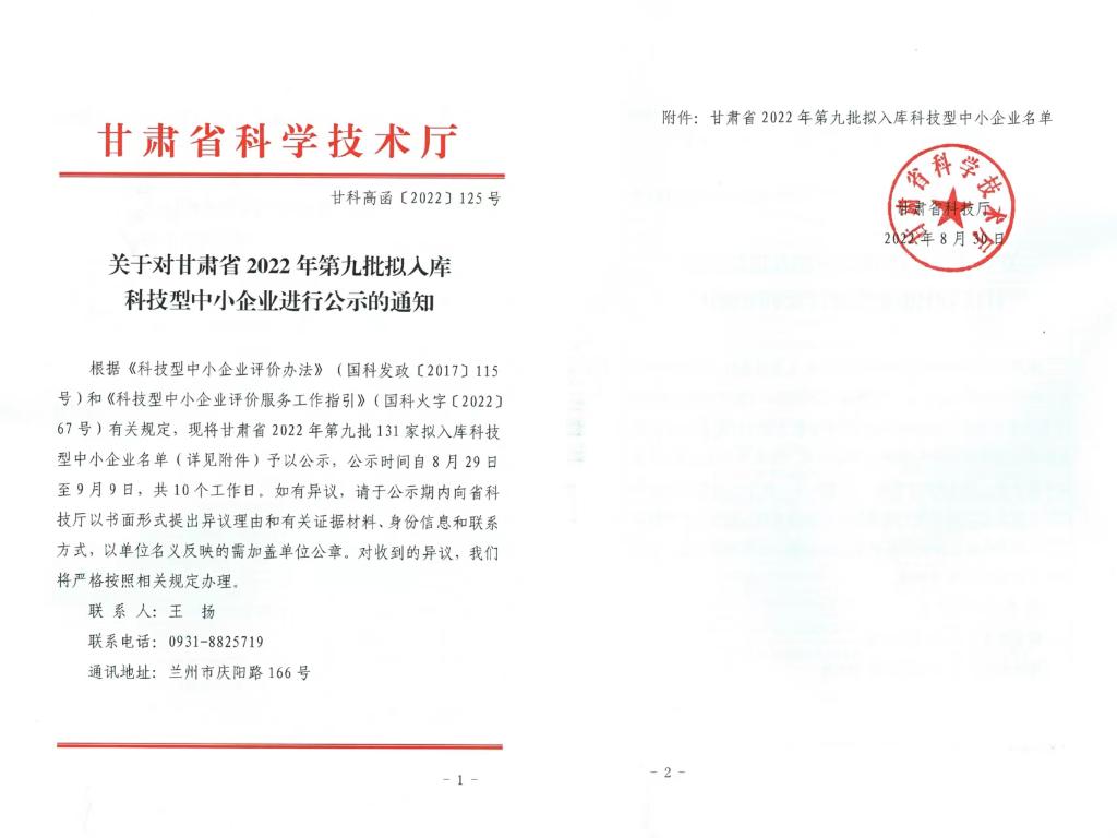 甘肅省2022年第9批拟入庫科技型中小企業名單公示正文.jpg PICTURE